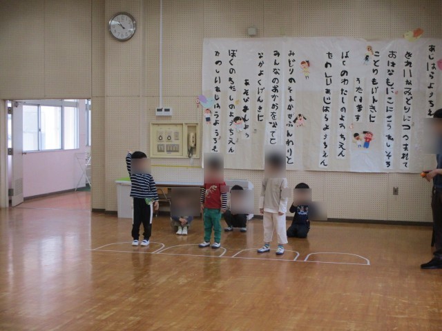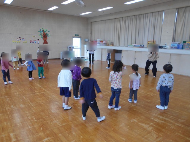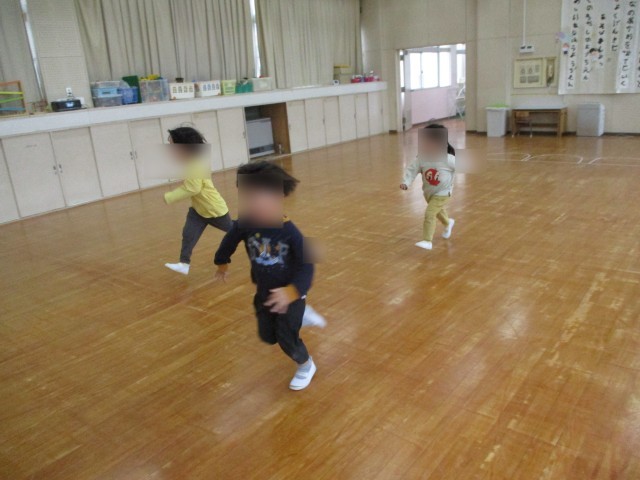 たんぽぽ組とさくら組一緒にリズム室で「こいぽぽり体操」とかけっこをしました。