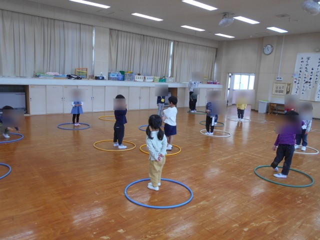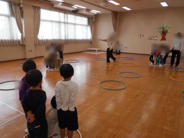 その後はフープを使って「お引越しゲーム」をしました。指定された色のフープに移動する時、どこにいこうか迷っている友達に「こっちだよ」と声をかけたり、入っている人数をみんなで数えてその数に「多すぎる~!」と驚いたりしていました。