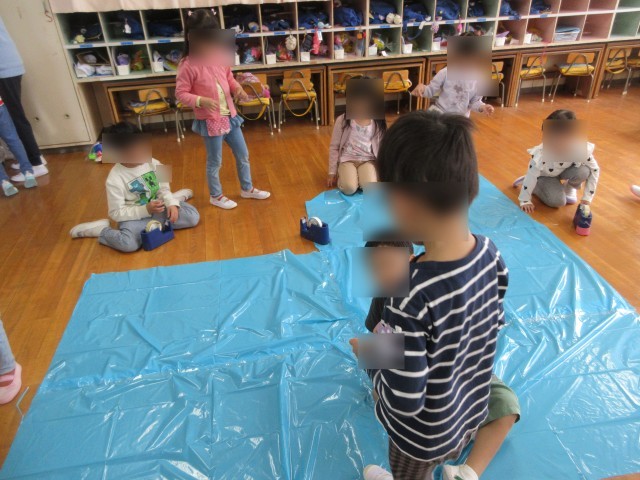 すみれ組はカラービニールで海と魚をつくって遊びました。