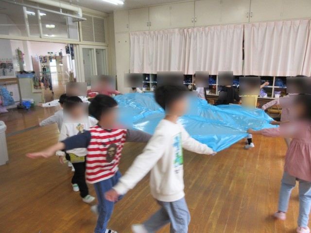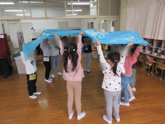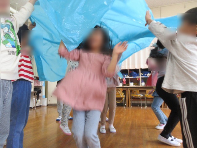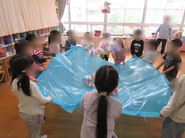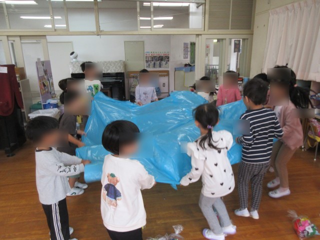 昨年の経験を思い出し、くるくる回ってみたり、順番に中に入ったりして遊び、最後にはポップコーンの歌に合わせて踊ることを楽しみました。