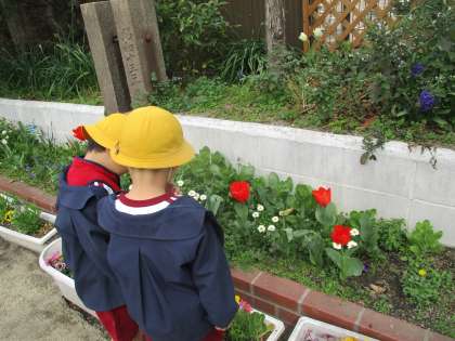そんな中で、園庭に植えたチューリップが咲いているのに気がつきました!