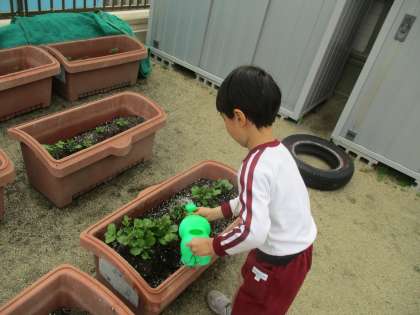 昨年度に植えたジャガイモの芽もどんどん大きくなっており、「お水をあげよう!」「大きくなってね!」と声をかけていました。