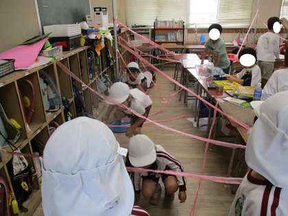 大江小学校のわくわくランドに全園児で行かせていただきました。子どもたちは、小学生のお兄さん、お姉さんが縦割り班で考えた様々な遊びに「ここ行ってみようよ!」や「どんなお店があるかなぁ?」などと言いながら、学校内を回ったり、修了児のお兄さん、お姉さんと久しぶりの再会を喜んだりしていました。