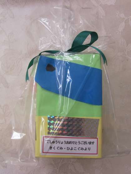 みんなで遊んだ後、まつ組に、手作りの鉛筆立てをプレゼントしました。