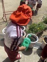 早速、今日、登園してくると子どもたちは野菜の苗を見たり、水をあげたりする姿が見られました。「おおきくなあれ!」「あま〜くなあれ!」と言っていましたよ!