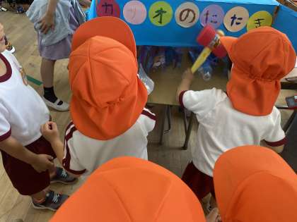 大江小学校が〈わくわくランド〉をしているということで、幼稚園の子どもたちも参加させてもらうことになりました。わなげ・ボーリング・カツオのたたき(モグラたたき)など、小学生の皆さんが考えた様々な遊びの場があり、「楽しい!」「あれもしたい!」と子どもたちは大盛り上がり!小学生のみなさんも、小学校の先生方もとても優しく声をかけてくれたり、接してくれたりしたので、みんなで楽しむことができました。