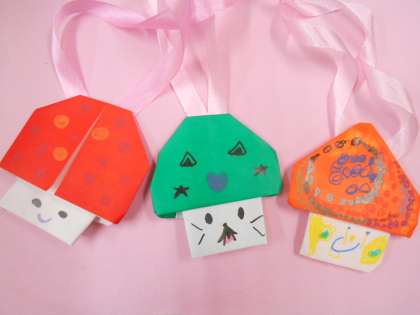 先日行った予行では、小さいお友達の代わりに走ってくれたひよこ組さんに、まつ組さんがプレゼントを渡しました。「ひよこ組さんが遊んでいるキノコがいいね」と考えてつくりました。運動会が楽しみですね!