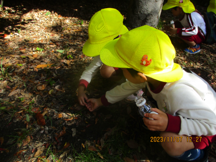 また、秋の自然に親しむことができるように、どんぐり拾いや落ち葉拾い、木の実拾いをしました。中には、バッタを捕まえている子どももいましたよ。