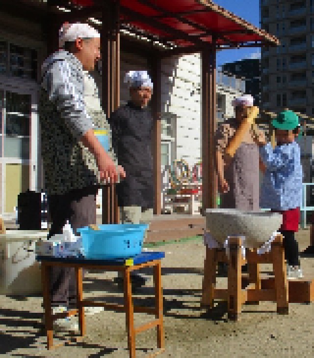幼稚園の園庭でもちつきをしました。もちつきの前日から保護者の方が子どもたちのために、道具や場の準備をしてくださいました。もちつき当日の子どもたちは、もち米を蒸している湯気や匂いを感じ、もちをつくことを楽しみにしていました。もち米が蒸し上がり、保護者の方がもちをついている様子を見せてくださりました。それを見て、期待をもちながら子どもたちがもちをつくと,おもちが延びる様子に驚いたり、つく時の音を聞いたりしながら、もちつきを楽しみました。
