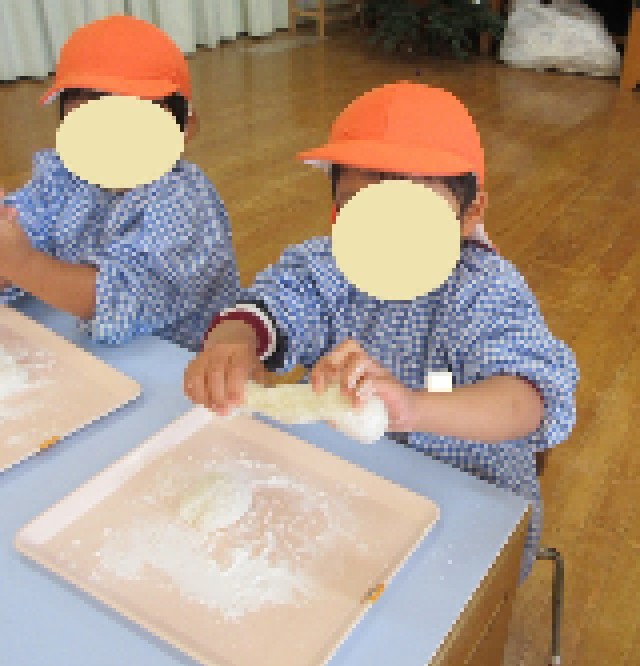 その後に、もちの感触を感じたり、もちが延びる様子をじっくり見たりしながら鏡餅をつくっていました。つくった鏡餅を持ち帰り、新しい年を迎える気持ちをもつことにつなげていきたいと思います。