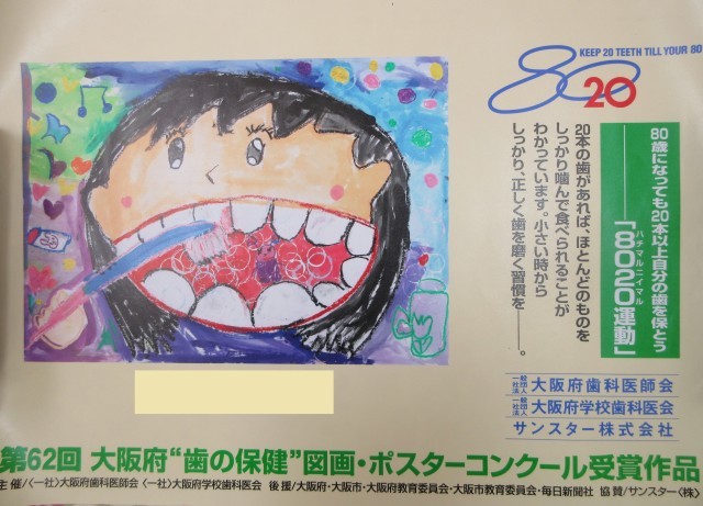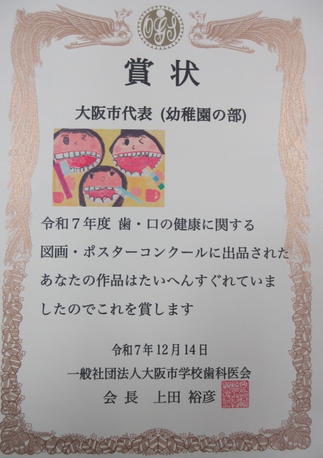 大江幼稚園の園児が、2つの賞を受賞されました。1つ目は、「第62回 大阪府<歯の保健>図画・ポスターコンクール」で入選され、こちらの絵は、11月の下旬に環状線の車内に展示されました。2つ目は、「令和7年度 歯・口の健康に関する図画・ポスターコンクール」で、大阪市代表に選出され、優秀賞を受賞しました。とても素晴らしい賞を受賞されました。おめでとうございます。