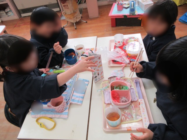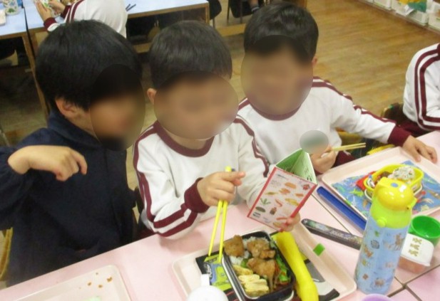 お弁当の時間にも、3色食品群を掲示し、自分たちのお弁当の中身を見ながら「赤の食べ物あったよ!」「ご飯は黄色?」と言いながら、食べている姿が見られました。ご飯をたべて「パワー!」と言っている子どももいました。
