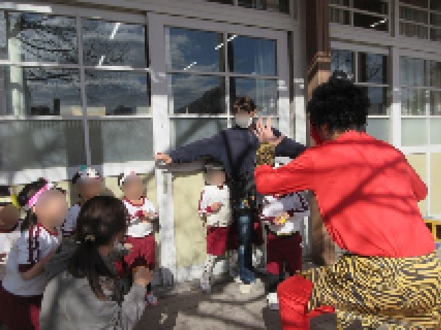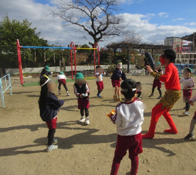 子どもたちは、鬼のお面や豆を入れる三方をつくり、節分遊びを楽しみにしていました。自分でつくった三方の中に豆を入れ、節分の由来の話を聞いていると、鬼が幼稚園にやってきました。鬼が突然きたことに驚く子どももいましたが、三方に入っている豆を「鬼は外!福は内!」と言いながら、豆まきをしました。節分の由来を知り、みんなが健康で幸せに過ごせることを願いながら、豆まきを楽しみました。今後も、日本の伝統行事に親しみをもつことができる機会を大切にしていきたいと思います。