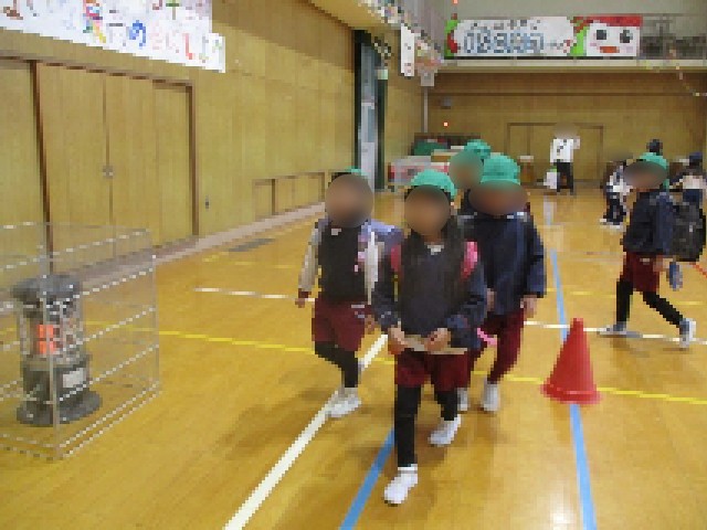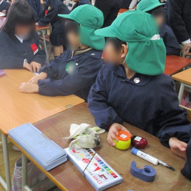 5歳児の子どもたちが、天王寺小学校に行かせていただき、1年生の教室で机と椅子を貸してもらったり、小学校で使うものを見せてもらったりしました。1年生の教室に入り、緊張した様子も見られていましたが、1年生のお兄さん、お姉さんが子どもたちに優しく声をかけ、関わってくれることに安心して過ごす姿が見られました。学校内を見学した後には、3年生が貸してくれたランドセルを背負って、体育館の中を歩かせてもらい、小学生ごっこを楽しんでいました。