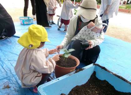 トマト、ナス、ピーマン、ツルナシインゲンの4つの野菜の中から、育てたい野菜を選んだ子どもたち。お家の人と楽しく苗植えをすることができましたね♪