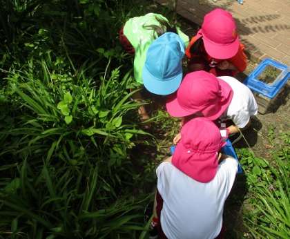 暑い日が増えてきて、幼稚園にもいろいろな虫や生き物が遊びに来ています。