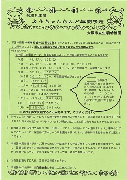 ふうちゃんらんど(未就園児園庭開放)の年間予定について 公開日 2024/06/05 更新日 2024/06/05 未就園児活動 令和6年度のふうちゃんらんど(未就園児園庭開放)の年間計画です。 幼稚園行事の関係により、変更がある場合があります。 ホームページで次回のふうちゃんらんど(未就園児園庭開放)の日程を、毎回お知らせしますので、幼稚園のホームページをご確認ください。 ぜひ遊びに来てくださいね♪ いいね(0)