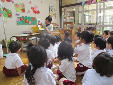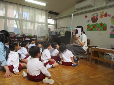 絵本を見た後は、ぶくぶくうがいは口の中のむし歯菌や食べかすを洗い流すことを、がらがらうがいはのどにくっついた風邪のばい菌を洗い流すことをイラストを見せて知らせました。