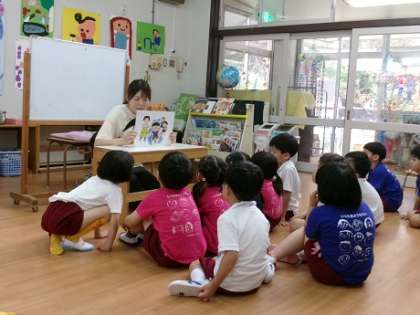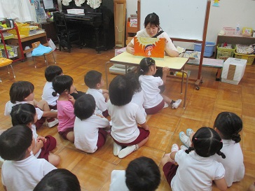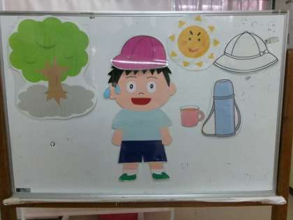 紙芝居の内容を振り返り、暑くてしんどくなる熱中症という病気があることを伝えると、子どもたちは「知ってる!」「テレビで見た」と話していました。