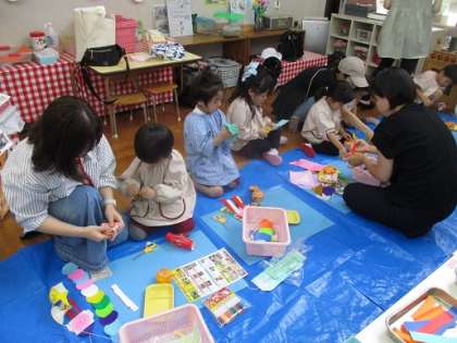 いろいろな形や色の折り紙を折ったり、つなげたり、切ったりして、お家の人と協力しながら、思い思いに飾りをつくっていました。