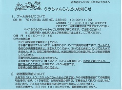 ふうちゃんらんど(未就園児プール開放)について 公開日 2024/07/18 更新日 2024/07/18 未就園児活動 7月19日(金)、22日(月)、23日(火)に、未就園児のお友達のプール開放がありますので、遊びに来てください。 10:00〜10:10に開門します。 プールに入水する時間は、10:30〜10:50の予定です。 事前予約は必要ありません。 詳しくは、画像の手紙をご覧ください。 中止の場合はホームページでお知らせいたします。 いいね(0)
