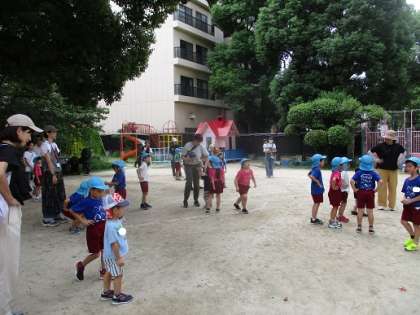 1学期は雨でお休みになることが多かったふうちゃんらんど(未就園児園庭開放)でしたが、この日は良い天気で、固定遊具や砂場で遊んだり、玉入れをしたりして元気いっぱいに遊びました。