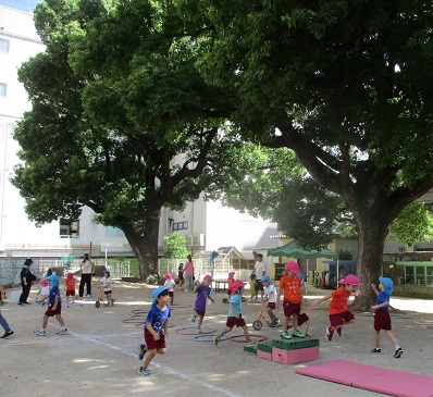 暑い日でしたが、玉入れをしたり、巧技台でつくったジャンプ台から思いきり跳んだりして元気いっぱい遊びました。