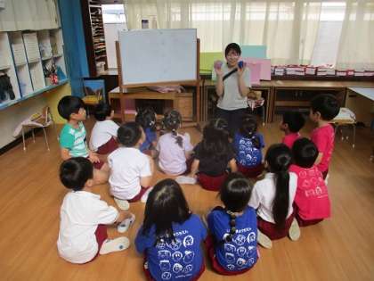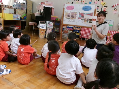 そら組・はな組の10月の保健指導では、絵本『ふわふわとちくちく』の内容を用いて、「ふわふわことばとちくちくことば」について話をしました。