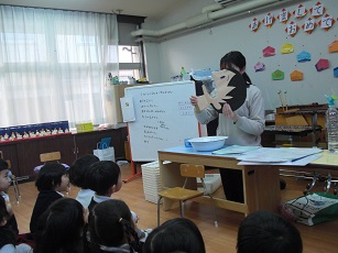 話の後は、うがい人形を使ってうがいの仕方を知らせました。