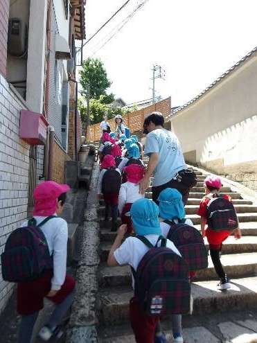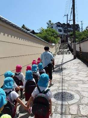 はな組(4歳児)とそら組(5歳児)のお友達で散歩に行きました。