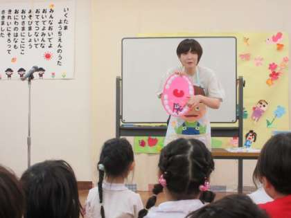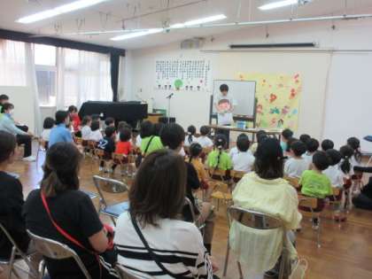 歯と口の健康週間がある6月に入ったので、大阪府歯科衛生士会の歯科衛生士さんを幼稚園へお招きし、歯みがき指導をしていただきました!