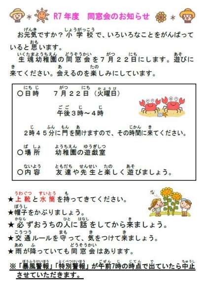 7月22日(火)の3時から、生魂幼稚園で同窓会を行います。