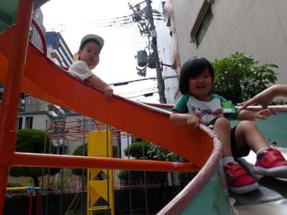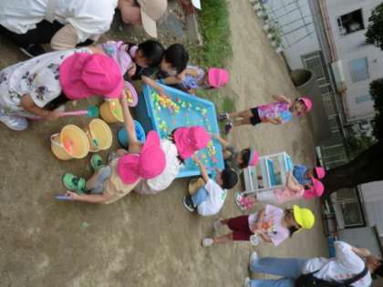 小さなお友達が遊びに来てくれて、スーパーボールすくいをしたり、すべり台をしたりと園庭でたくさん遊びました。