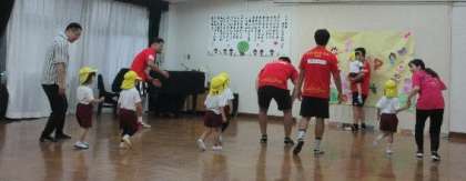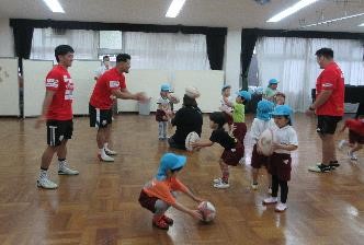 ラグビーチームのレッドハリケーンズの選手の方々が、幼稚園に遊びに来てくれました。