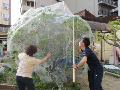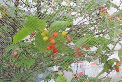 サクランボの実が色づいてきたので、鳥除けのため、ネットをかけました。 収穫が楽しみですね!
