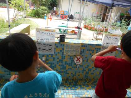 また、歯ブラシを咥えたまま立ち歩かないこと、唾がとばないようにおしゃべりをせずにみがくこと、うがいの水は静かに吐きだすことなどの歯をみがく時の約束についても確認しました。