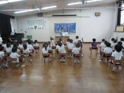 始業式では園歌を歌い、園長先生の話を聞きました。
