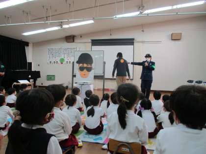 10月20日(木)幼稚園に、大阪府警(生活安全課)の方と天王寺区役所の方をお招きし、防犯教室を行いました。