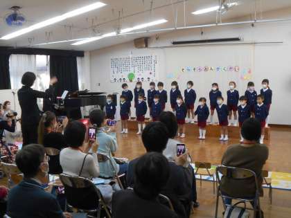 「くだものれっしゃ」「まつぼっくり」「おいもごろごろ」「いちょうのはっぱ」「にじのむこうに」の5曲を披露しました。