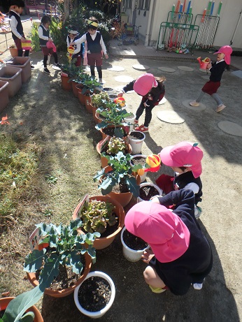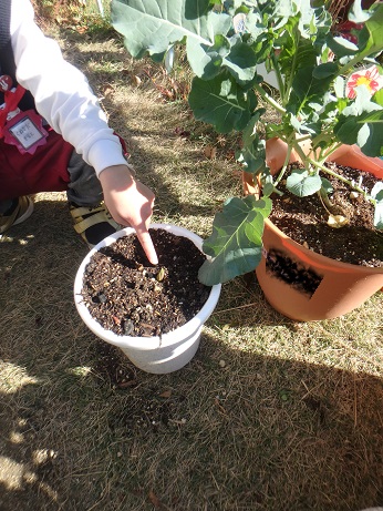 「先生見てみて!チューリップの芽が出てる!」と小さな芽に気付いた子ども達。