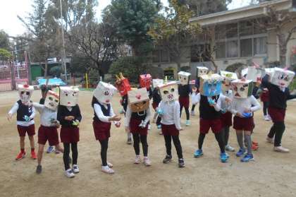 自分の鬼のお面や豆入れをつくって、園庭や保育室に豆をまきました。「鬼はそと」「福はうち」と元気いっぱい声をかけ、豆をまいていました。