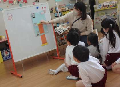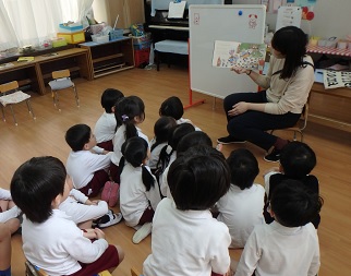 発育測定の後、『ねこすけくん なんじにねたん?』という本を読み、「早寝・早起きの大切さ」について保健指導をしました。