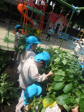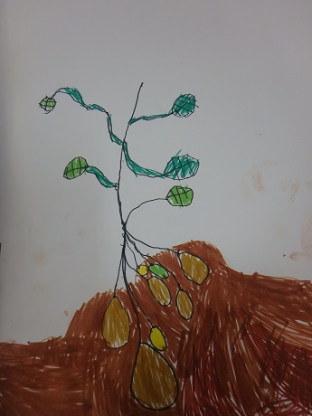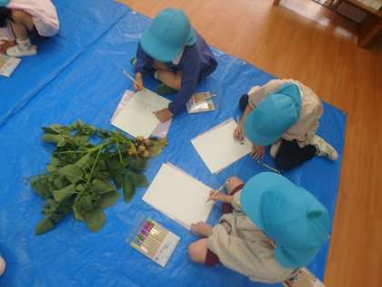 去年の2月に植えたジャガイモが立派に生長しました。茎を思いきり引っ張るとたくさんのジャガイモが!!「すごーい」「大きいジャガイモいっぱいや」と子どもたちも大喜びでした。部屋に持ち帰り、「根っこすごいね」「ジャガイモいっぱいつながってるね」「茎、長いなぁ」と見たことや感じたことを友達と話をしたり、絵にかいたりすることを楽しみました。たくさんとれたジャガイモは家に持ち帰る予定なので、どんな料理をして食べたのか教えてね。