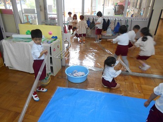 ローラーを転がしていると「雨がお散歩してる」「コロコロ転がっていくー」と話をしながら楽しんでいました。