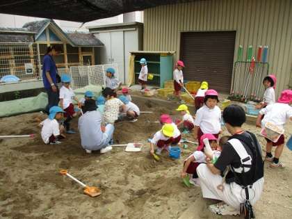 「一緒に砂場で遊ぼう!」と誘ったり、手をつないで連れて行ったりする姿が見られました。