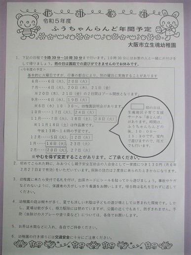 ふうちゃんらんど(未就園児園庭開放)の年間予定について
