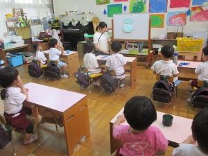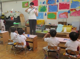 その食べかすをねらってむしば菌がやってきて、カバくんの歯を真っ黒のむし歯にしてしました。子どもたちは「歯みがきしなかったからや」と話したり、カバくんが歯みがきを始めると、「あそこにまだのこっているよ」と食べかすのついた場所を教えてくれたりしました。