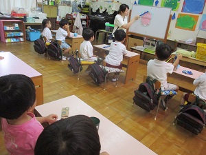 ほし組のみんなも、お弁当の後に歯みがきを始めました。歯の模型でみがく場所を見ながら、みんなでみがいています。子どもたちは、シャカシャカと上手に歯ブラシを動かしています。