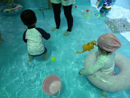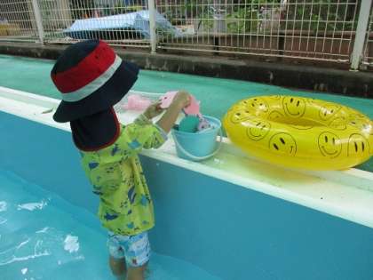 幼稚園の大きなプールで浮き輪やボールを使って遊んだり、プールサイドで海の生き物すくいや水鉄砲をしたりして、たくさん遊びました。