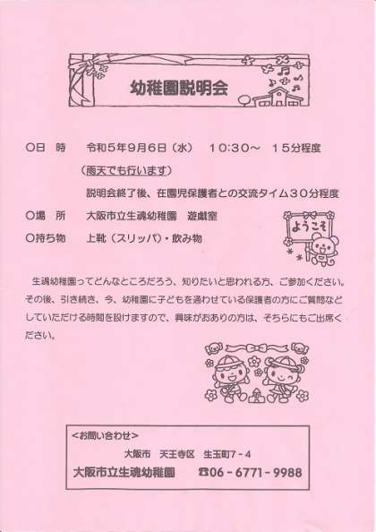 幼稚園説明会を行います 公開日 2023/08/24 更新日 2023/08/24 未就園児活動 9月6日(水)のふうちゃんらんど(未就園児園庭開放)の後、10時半から15分程度で幼稚園説明会を行います。 事前予約はいりませんので、ぜひご参加ください。 いいね(0)